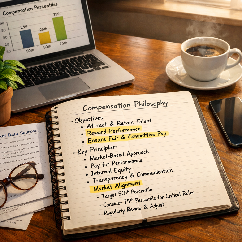 A compensation philosophy is a formal statement that defines where your organization intends to position employee pay relative to the external market. It sets the target: are you paying at the 50th percentile (market median), the 75th percentile (above market), or somewhere else? It also articulates why, connecting pay strategy to business goals like talent attraction, retention, or cost management.